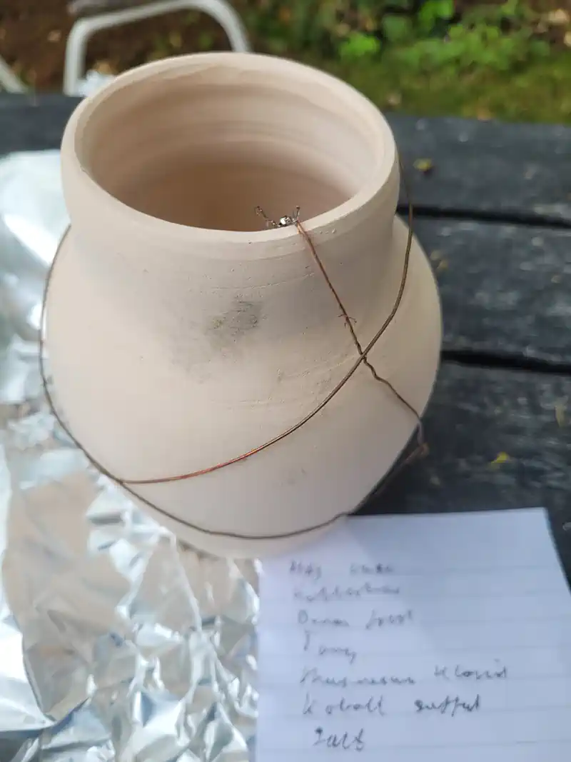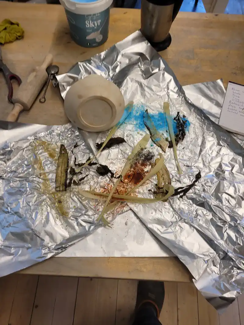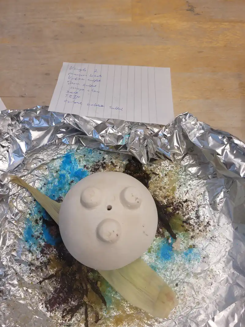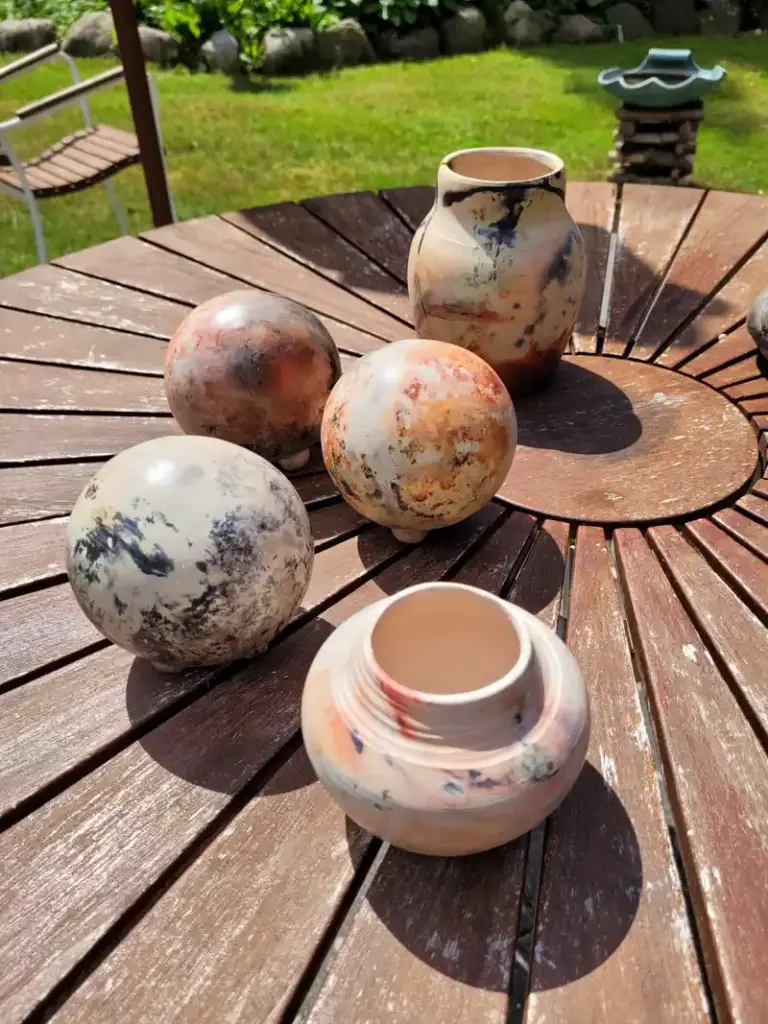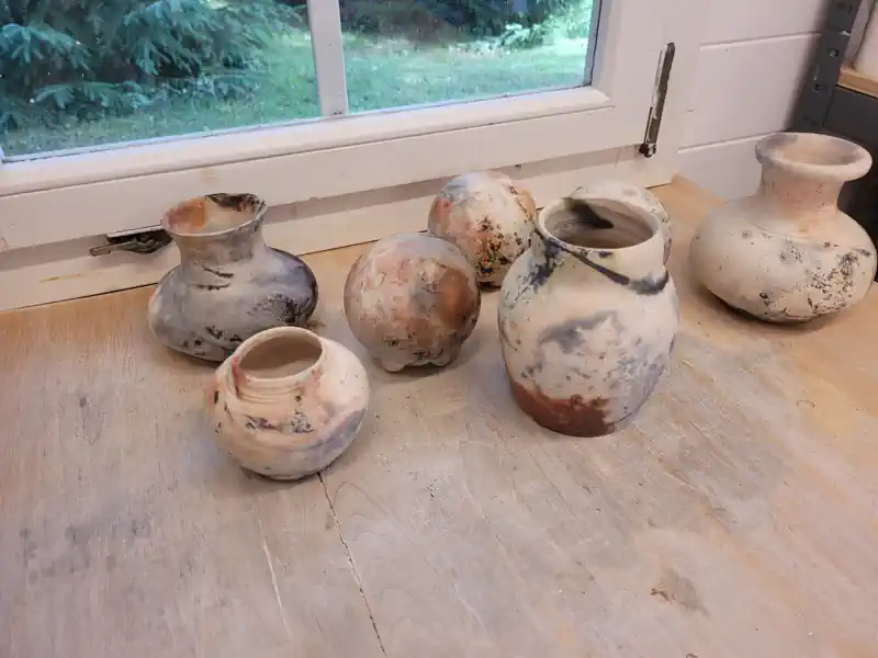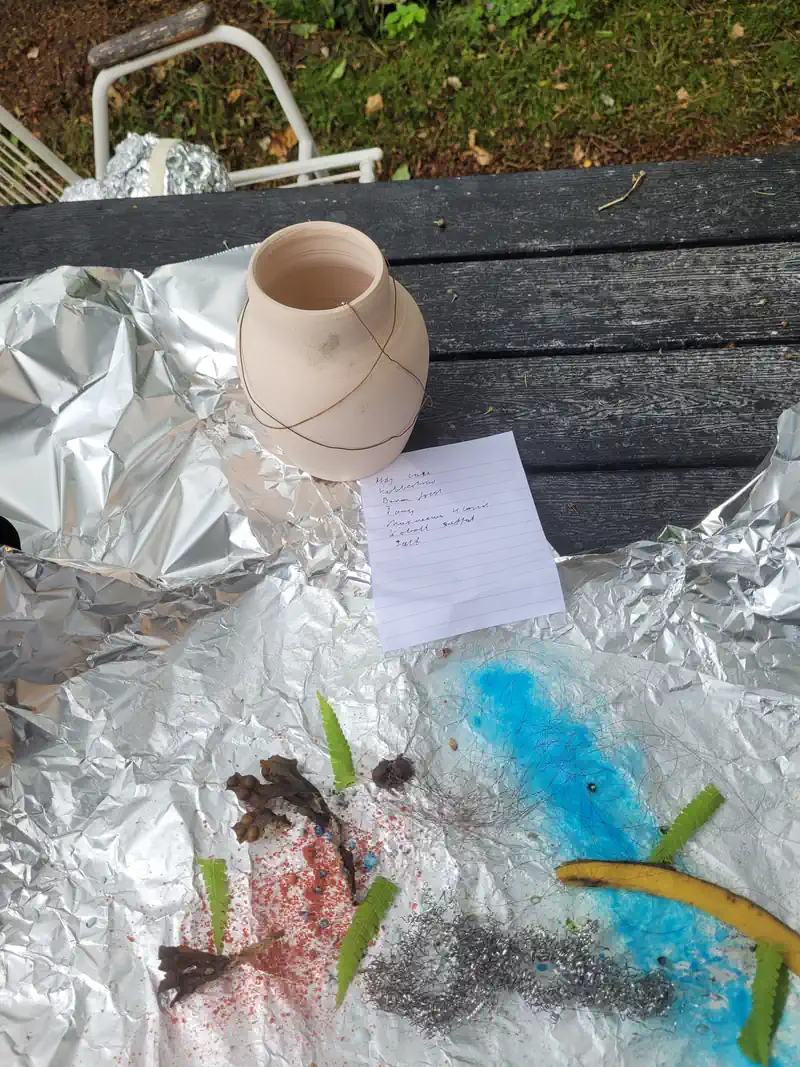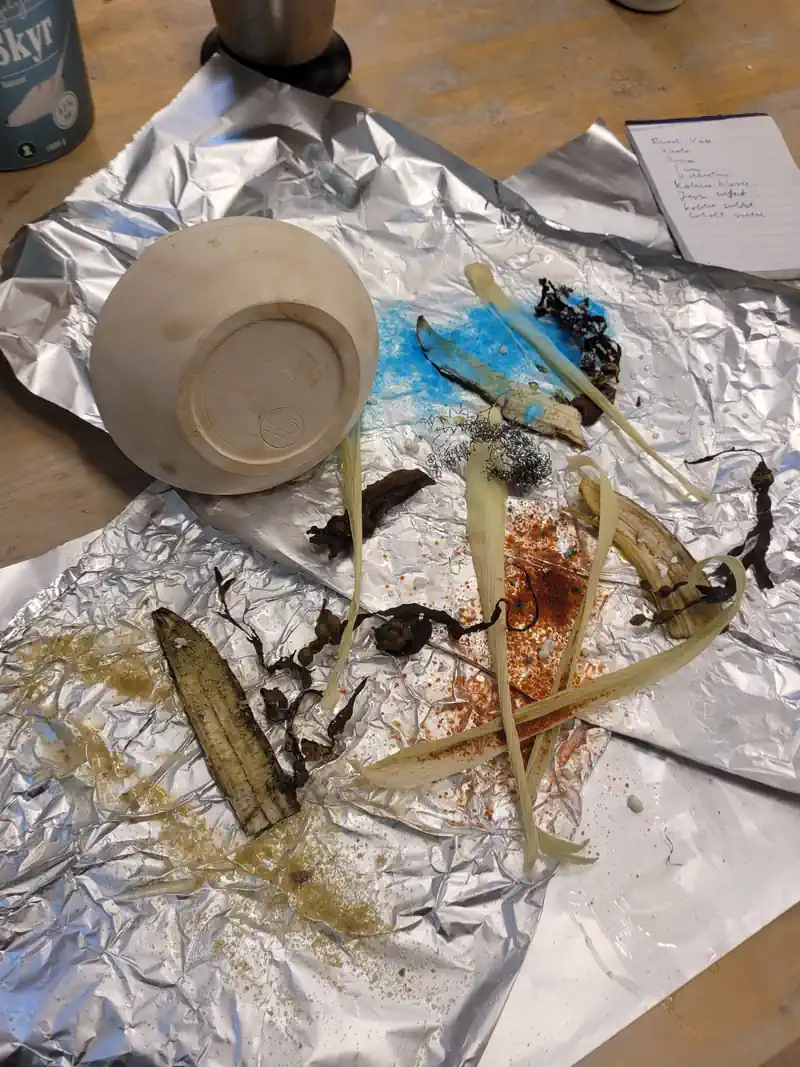 Eller tørrede bananskræller, eller hestehår…. Det hele pakket i små lerpakker og brændt i en olietønde i 4 timer for fuld power. Dernæst afkøler den til næste dag. Og dagen efter er det magiske øjeblik når det hele bliver pakket ud.