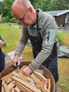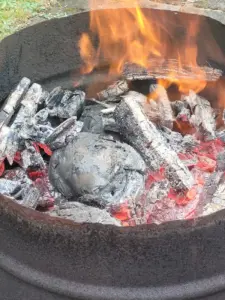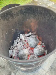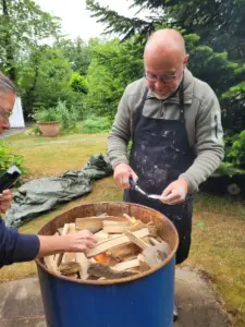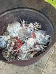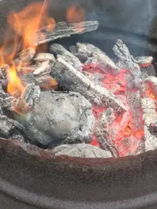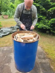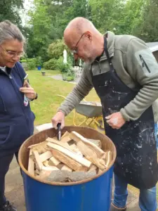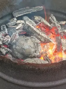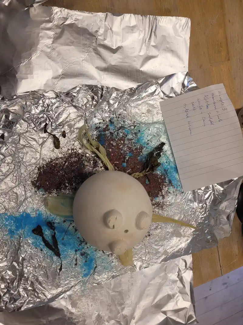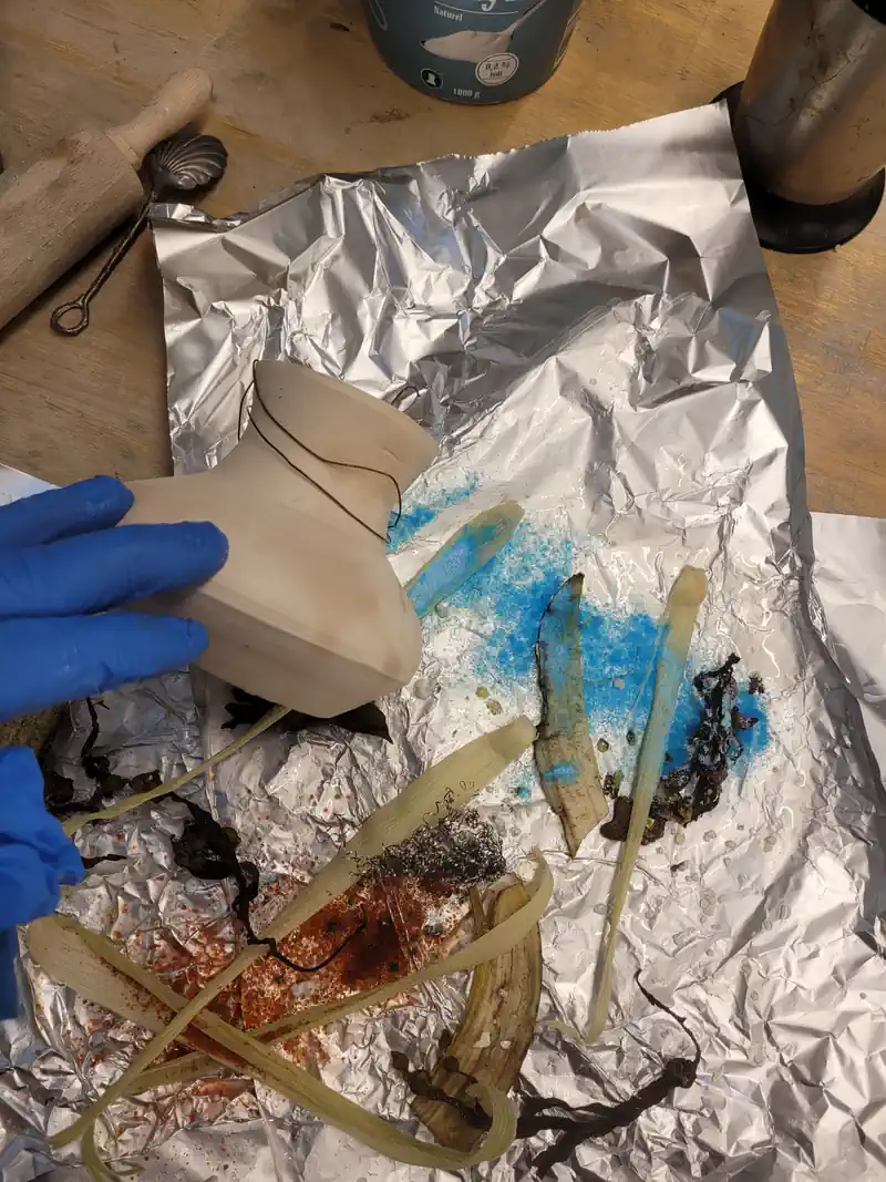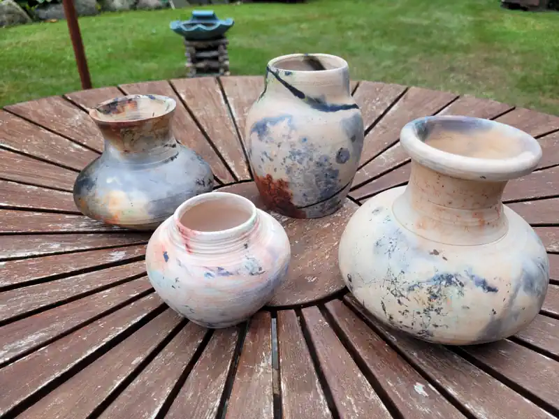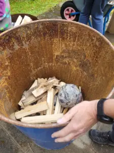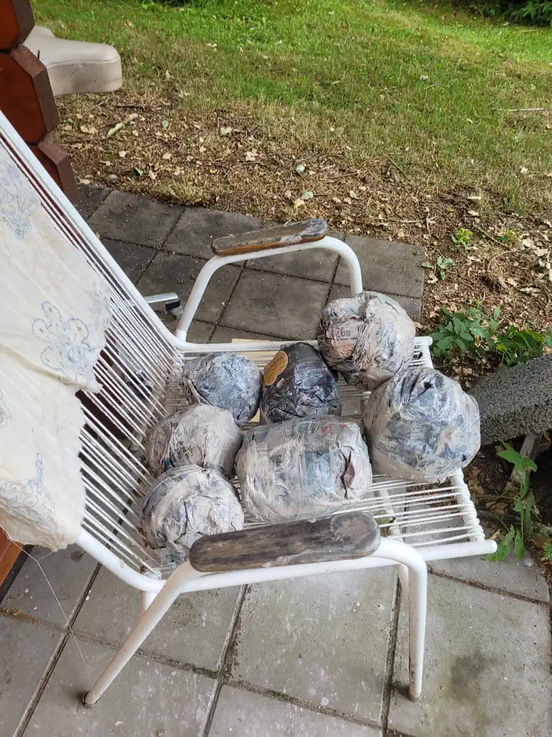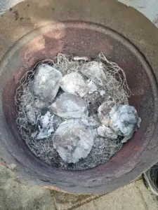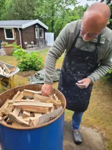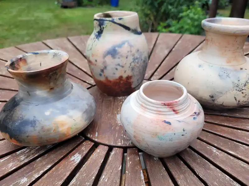 Eller tørrede bananskræller, eller hestehår…. Det hele pakket i små lerpakker og brændt i en olietønde i 4 timer for fuld power. Dernæst afkøler den til næste dag. Og dagen efter er det magiske øjeblik når det hele bliver pakket ud.