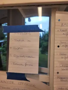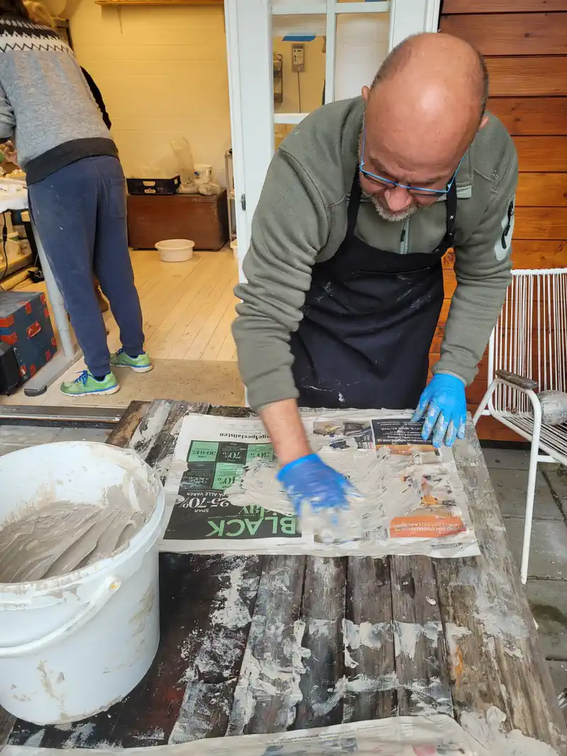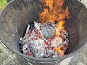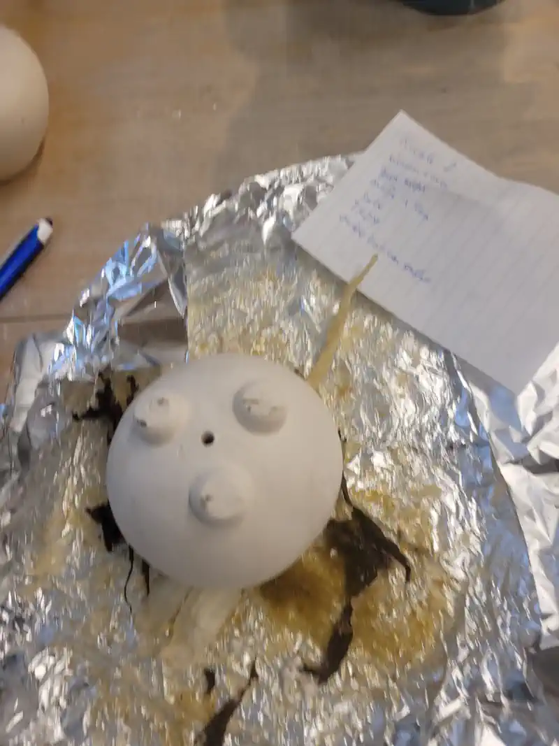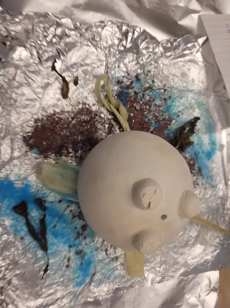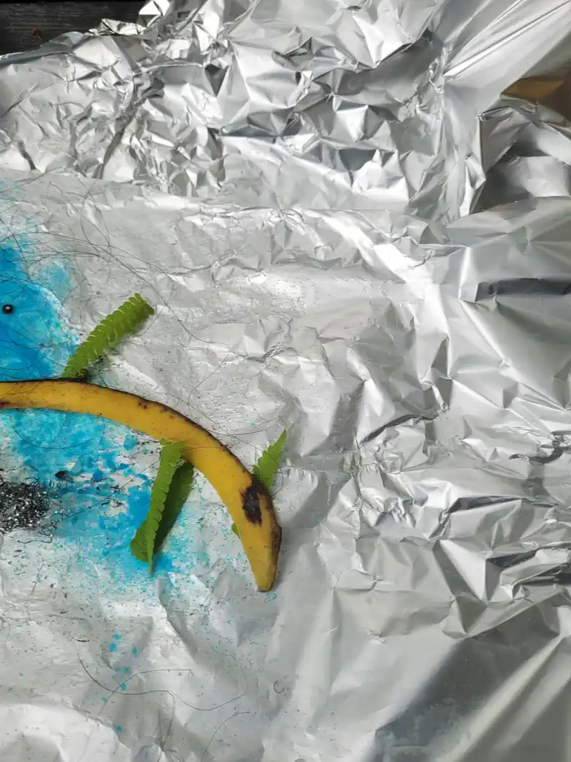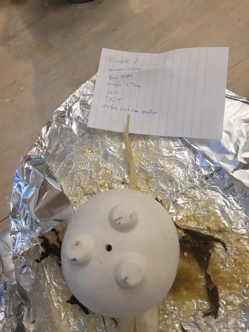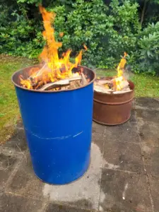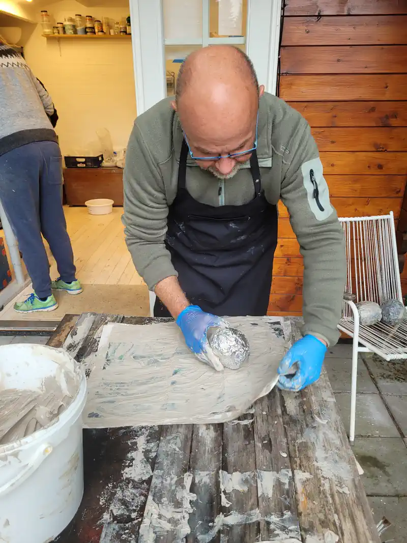 Eller tørrede bananskræller, eller hestehår…. Det hele pakket i små lerpakker og brændt i en olietønde i 4 timer for fuld power. Dernæst afkøler den til næste dag. Og dagen efter er det magiske øjeblik når det hele bliver pakket ud.
